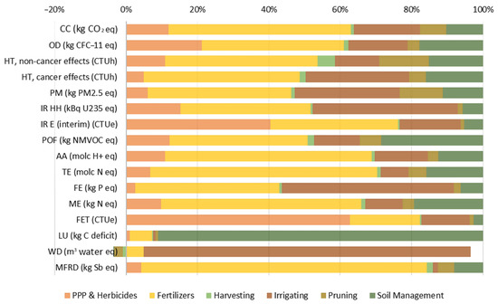The values of EI in Turkey for the most representative case (intensive non-irrigated and irrigated) are shown by activities in Table 7 and, specifically for the CC category, in Figure 3. Attending to the EI of the mix representative value chain in CC category, fertilizers are responsible for 51.1% of the total EI, being the most impactful activity. They are followed by irrigating (18.6%), PPP and herbicides (11.9%) and soil management (10.3%) at the farming stage.