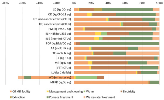 Thus, and following that rate, the EI due to the industrial phase in Turkey derives from the two- and three-phase mix, in a proportion of 45% and 55%, respectively. Results presented in Table 8 and Figure 4 show an EI in the CC category of 0.51 kg CO2 eq per FU. The main reason for this high impact is the pomace treatment. Likewise, there are some gains in other categories caused by a rise in the inputs. The oil mill facility, as a significant example, has almost doubled its impact in this country because OOMs in Turkey are less efficient in terms of m² of building per kg of olive oil produced, as the data collection indicated.