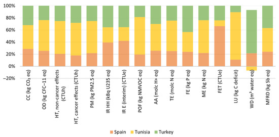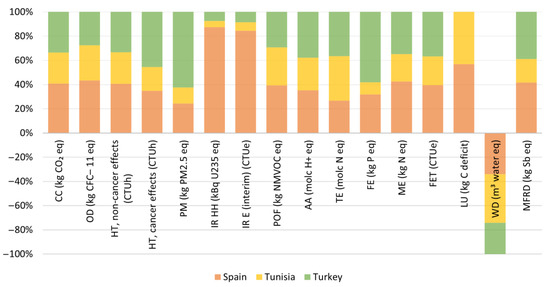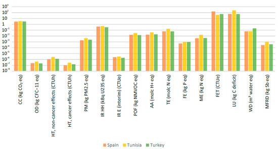 Summarizing, the global behavior in all categories of those three countries’ EI has been compared with a logarithmic scale in Figure 10. In this graphic, it can be observed how Tunisia is, by far, the most impactful country in most categories (14 of 16 categories), while Spain and Turkey have more similar values between them. It is a consequence of the high importance of the farming phase, which is responsible for most differences between values.