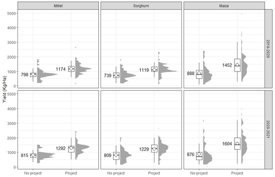Boxplot/distribution plot showing yields of millet, sorghum, and maize in the years 2019–2020 and 2020–2021 with and without projects. The numbers presented in the boxes represent the means (also indicated by the diamond inside each box). The line inside each box represents the median.