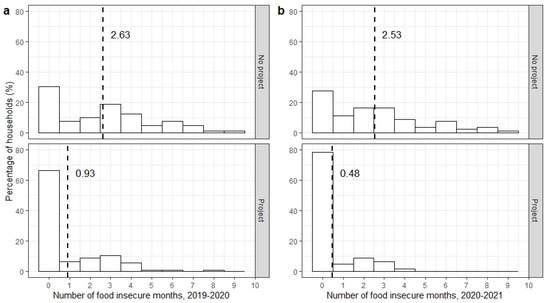 Number of food insecure months in non-participating households (“No project”) compared to participating households (“Project”). The number inside each figure shows the mean. Figure (a,b) present results for 2019/2020 and 2020/2021 respectively.