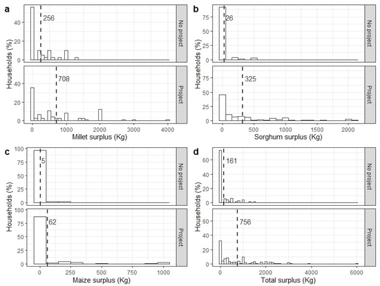 Surplus production of millet (a), sorghum (b), maize (c) and total cereal surplus (d) in household participating in the project and households not participating. The number inside each figure is the mean.