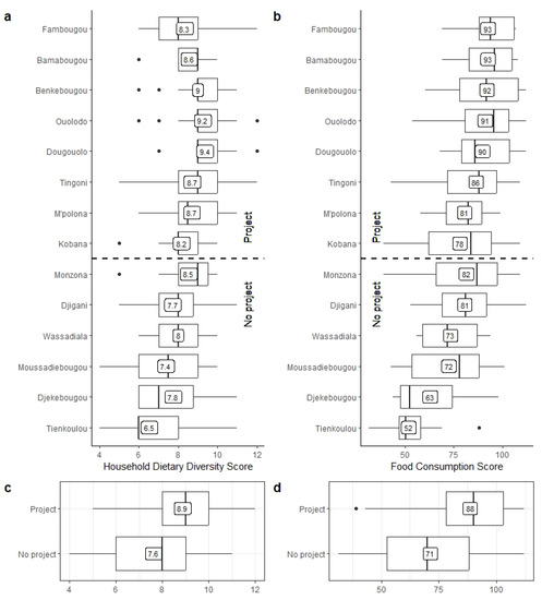 Household dietary diversity score (HDDS) and food consumption score (FCS) in all the ACC villages and the non-ACC villages. The numbers in the boxes represent the mean value for each village. The figures (a,b) present the HHDS and FSC for all the villages while the figures (c,d) show the mean for all the villages and the variability between the villages in HHDS and FSC. The dotes present the outliers.