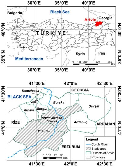 Artvin Province, located in the northeast of the Black Sea Region, is one of the 36 provinces in Turkey where olive cultivation is carried out []. The micro-climatic conditions in Artvin and the Black Sea Region allow olive cultivation in the region []. Therefore, this study was conducted in the Merkez and Yusufeli districts, which are at the forefront of olive production in Artvin Province. The study area, which has a surface area of 3466 km2, is located between 40°34′8.4″ and 41°21′25.2″ north latitude and 41°9′32.4″ and 42°10′43.8″ east longitude (Figure 1).