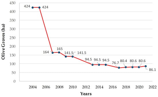 According to the activity reports of the Artvin Provincial Directorate of Agriculture and Forestry [], the olive fields in Artvin were 424 hectares in total at the beginning of the 2000s, while this decreased to 86.1 hectares in 2021 (Figure 2). When Figure 2 is examined, the decreases in 2007, 2013, and 2017 are noticeable. The effect of the large dams mentioned above can be seen in this decrease in olive fields. In contrast, an increase of 5.5 hectares in olive fields in 2021 draws attention (Figure 2). It can be said that olive saplings produced by the Artvin Provincial Directorate of Agriculture and Forestry and distributed free of charge to the public were effective in this increase.