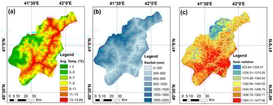 Meteorological maps of the study area: (a) average temperature, (b) average total precipitation, and (c) solar radiation.