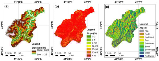 Topographic maps of the study area: (a) elevation, (b) slope, and (c) aspect.