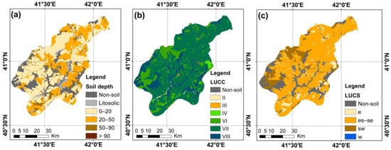 Soil properties maps of the study area: (a) soil depth, (b) LUCC, (c) LUCS.