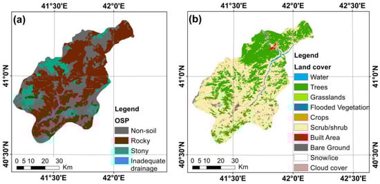 (a) OSP map of the study area and (b) land cover map of the study area.