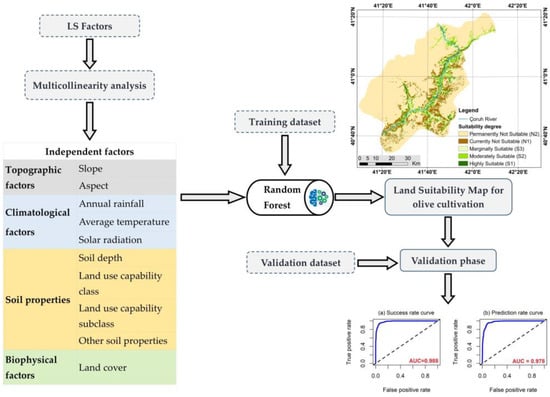 Many large dams built on the Çoruh River have resulted in the inundation of olive groves in Artvin Province, Turkey. This research sets out to identify suitable locations for olive cultivation in Artvin using the random forest (RF) algorithm. A total of 575 plots currently listed in the Farmer Registration System, where olive cultivation is practiced, were used as inventory data in the training and validation of the RF model. In order to determine the areas where olive cultivation can be carried out, a land suitability map was created by taking into account 10 parameters including the average annual temperature, average annual precipitation, slope, aspect, land use capability class, land use capability sub-class, soil depth, other soil properties, solar radiation, and land cover. According to this map, an area of 53,994.57 hectares was detected as suitable for olive production within the study region. To validate the created model, the receiver operating characteristic (ROC) curve and the area under the ROC curve (AUC) were utilized. As a result, the AUC value was determined to be 0.978, indicating that the RF method may be successfully used in determining suitable lands for olive cultivation in particular, as well as crop-based land suitability research in general.