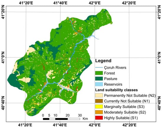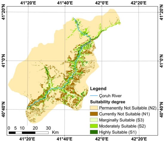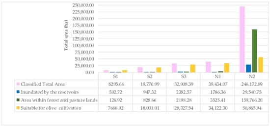 Because agricultural activities are not permitted in forest and pastureland under Turkish law, and water is being/will be held in the aforementioned dams, these regions were eliminated from the suitability map, and the final suitability map was created (Figure 9). Figure 10 shows the areal distribution graph of suitability evaluation groups.
