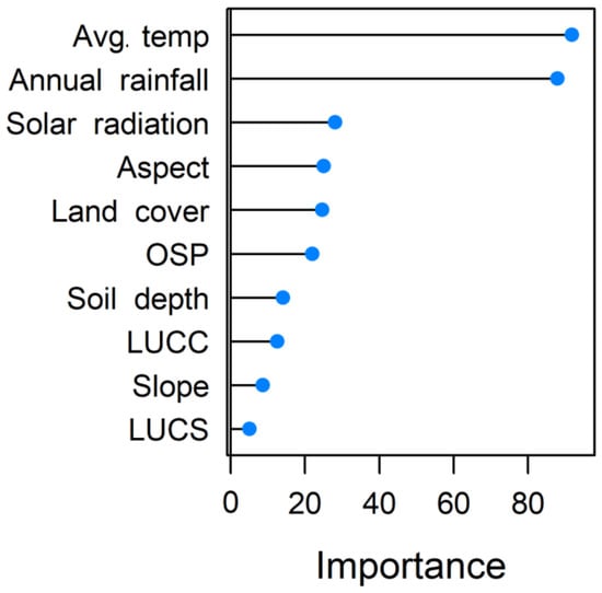It is also important to analyze the effects and relative importance levels of the parameters used in researching the suitability of the land for olive cultivation on a regional scale. In this context, the relative importance levels of the parameters used for olive cultivation with the RF algorithm are seen in Figure 11. This figure was produced using the built-in variable importance (or feature importance) function (varImp) of the RF algorithm. The variable importance function assigns a score that expresses how useful the input variables are in estimating a target variable, using techniques such as Gini importance and permutation variable importance []. Relative importance scores can be used in a predictive model to better understand the data and the model and reduce the number of input features. In the RF model produced in this study, average temperature and annual total precipitation were the two most important and effective parameters, while LUCS and slope were the least important and effective parameters. Again, solar radiation, aspect, land cover, OSP, soil depth, and LUCC parameters were also effective in order of importance (Figure 11).