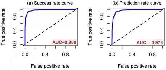 On the other hand, two different ROC curves are used to evaluate the performance of a model. These are the success rate curve and the prediction rate curve []. While the success rate curve is produced using the training data set, the prediction rate curve is produced using the validation data set []. The predictive ability of a model is evaluated using the prediction rate curve. In this study, the success rate curve was produced using the training data set and the prediction rate curve was produced using the validation data set (Figure 12). The AUC values of the curves were determined as 0.988 and 0.978, respectively. These AUC values show that the RF model has excellent performance.