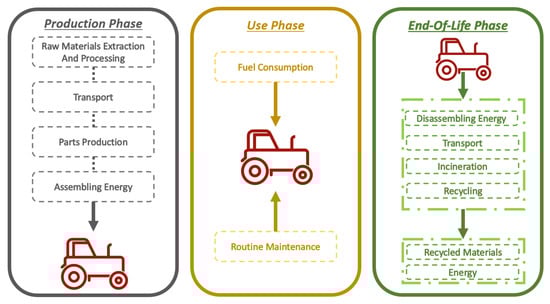 The analysis focuses only on the tractor system according to a cradle-to-grave approach. The life cycle of the tractor is subdivided into three main parts: