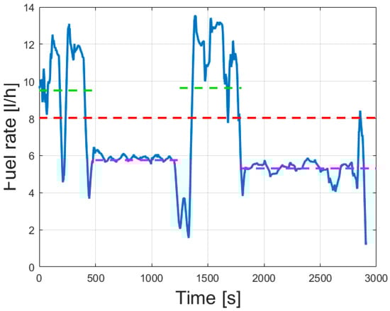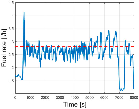 The purpose of the fuel-consumption evaluation was to obtain an average value for the tractor’s diesel fuel consumption in terms of liters/hour (shortened to l/h). The aim was to achieve a fuel-consumption estimation in the most accurate possible way with respect to real life. Therefore, the value for the average amount of fuel consumed was obtained by combining primary data and secondary data extracted from the literature and fuel-consumption models. The first step was the definition of a reference duty cycle. Belogj et al. [45] defined an average duty cycle profile scenario for a 76 kW orchard tractor based on 1000 h of operating time: