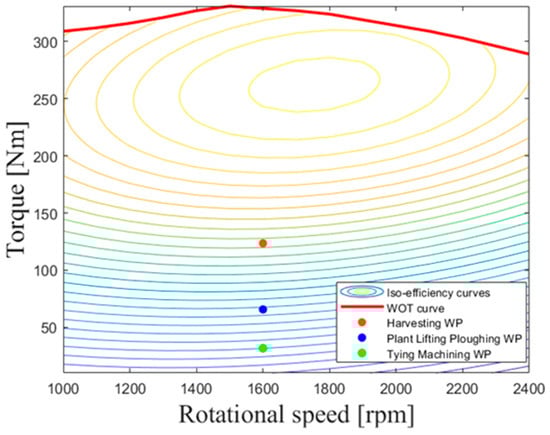 Engine and tractor transmission efficiency improvement is probably the most direct method to limit diesel fuel consumption. Indeed, the use of a diesel engine within its best efficiency range is surely the most direct method to limit diesel fuel consumption. In this regard, the investigation of alternative powertrains and propulsion systems is essential to pursue carbon containment [55,56]. Improvements in tractor transmission could lead to the optimization of tractor idle phases other than diesel fuel-rate reduction.