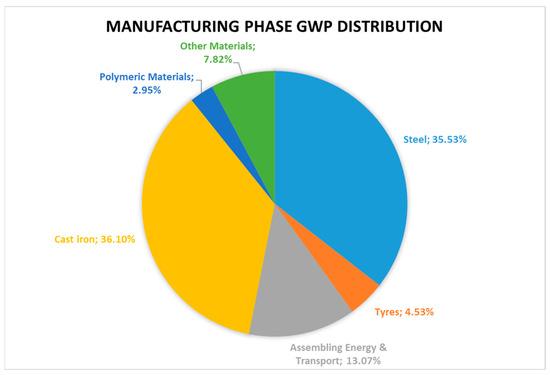 The chassis and powertrain (Table 6) subsystem was modelled considering only the two primary materials forming them: cast iron and steel. The assembly energy was not considered in this case, since it was counted in the final assembly energy for the entire vehicle.