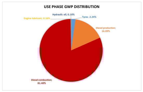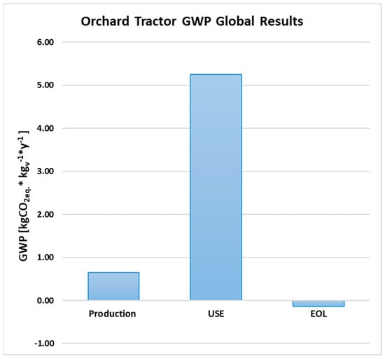 Speaking in absolute terms, the production phase developed 16,117 kg CO2eq.; during service life, 131,860 kg CO2eq. was generated (considering a 10 year life span); and the end-of-life stage allowed the recovery of 3620 kg CO2eq.. This is also noticeable in other works [21], where the incidence of the use phase was about 85%. The results obtained in this work are referred to an average annual work usage of this type of tractors derived from the literature. Consequently, the different peculiar characteristics of each agricultural application where this class of tractors are used (orchards, vineyards, hazelnut fields, etc.) can affect the estimated quantity of CO2 emissions related to the use phase. Future works will address more in details the variability of these results with the specific field of application of the tractor. Anyway, the overall distribution of the GWP impact category is not expected to change in reason of the average nature of the proposed work cycle.