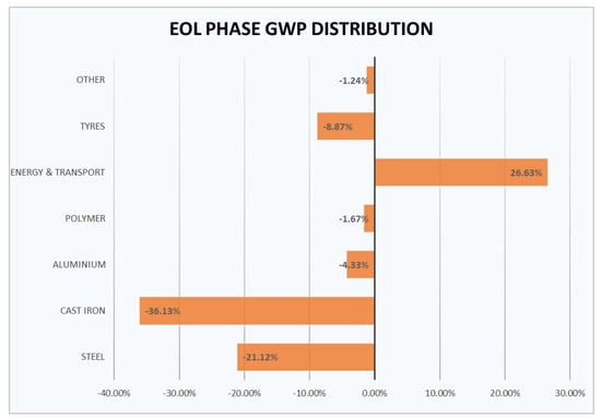 The aim of the recycling process is to recover raw materials and energy, such as thermal energy to avoid their subsequent production from primary sources. The carbon footprint of the recycling process is of −1.45 × 10−2 kg CO2eq. · kgvehicle−1 · year−1. In particular, the processes necessary for the recycling of materials produced emissions of 1.15 × 10−2 kg CO2eq. · kgvehicle−1 · year−1, whereas the outputs of the same processes spared −1.56× 10−1 kg CO2eq. · kgvehicle−1 · year−1 in future GHG emissions.