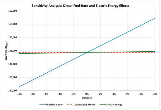 Lastly, a sensitivity analysis has been conducted to demonstrate the consistency of the trend obtained from the environmental assessment. The sensitivity analysis consists of the evaluation of the results obtained from a model caused by the fluctuation of one or more input variables. For this study, the sensitivity analysis was carried out modifying the two most important variables susceptible to changes: diesel fuel-rate and the electric energy for assembling/disassembling the tractor.