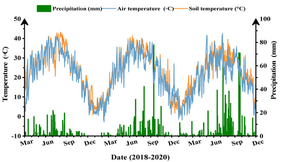 Rainfall and temperature data are based on the Weinan meteorological bureau of Baishui County, which is about 2 km from the experimental area. The measurement of soil temperature was conducted using the meter (Dongguan Wanchuang Electronic Products Co., Ltd., Dongguan, China), at a depth of 0 to 20 cm.