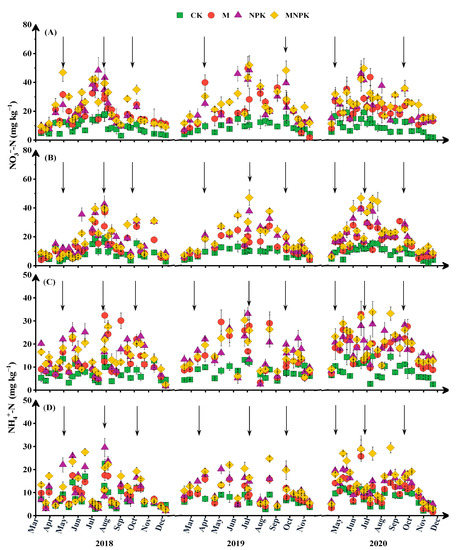 The NO3−-N and NH4+-N content in the apple orchard under different management measures, (A) NO3−-N in the plastic mulching treatment, (B) NO3−-N in the no mulching treatment, (C) NH4+-N in the plastic mulching treatment, and (D) NH4+-N in the no mulching treatment, control CK, organic fertilizer M, inorganic fertilizer NPK, and organic combined with inorganic fertilizer MNPK. The black arrow pointing down indicates the time of fertilization.