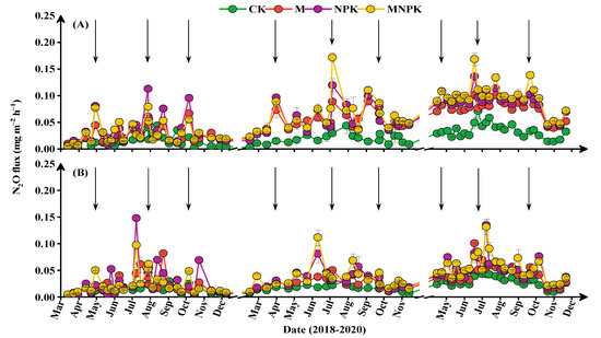 Effect of the N2O emission rate in the apple orchard under different management measures, (A) plastic mulching PM, (B) no mulching NM, control CK, organic fertilizer M, inorganic fertilizer NPK, and organic combined with inorganic fertilizer MNPK. The black arrow pointing down indicates the time of fertilization.