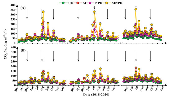 Effect of the CO2 emission rate in the apple orchard under different management measures, (A) plastic mulching PM, (B) no mulching NM, control CK, organic fertilizer M, inorganic fertilizer NPK, and organic combined with inorganic fertilizer MNPK. The black arrow pointing down indicates the time of fertilization.