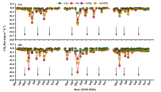 Effect of the CH4 uptake rate in the apple orchard under different management measures, (A) plastic mulching PM, (B) no mulching NM, control CK, organic fertilizer M, inorganic fertilizer NPK, and organic combined with inorganic fertilizer MNPK. The black arrow pointing down indicates the time of fertilization.