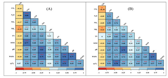 Correlations between environmental factors and GHG emissions, (A) plastic mulching PM, (B) no mulching NM, CH4: methane, CO2: carbon dioxide, N2O: nitrous oxide, NH4+-N: ammonium nitrate, NO3−-N: nitrate nitrogen, TN: total nitrogen, SOM: soil organic matter, ST: soil temperature, WFPS: water-filled pore space. *, **, and *** indicate significant effects (p < 0.05), highly significant effects (p < 0.01), and extremely significant effects (p < 0.001), respectively.