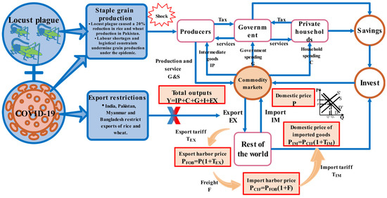 In 2020, the impact of COVID-19 on the global grain supply and the destruction of crop production by the locust plague posed serious threats to the grain trade patterns of South Asian countries. The effects of the labor shortages and logistical restrictions caused by COVID-19 on grain production were complicated by the locust plague sweeping some South Asian countries. Moreover, the export restrictions imposed by the major grain-producing countries in South Asia aggravated the damage caused by COVID-19 to the supply of grain. The theoretical framework of the combined impacts of COVID-19 and locust plague on grain trade patterns in South Asia is shown in Figure 1.