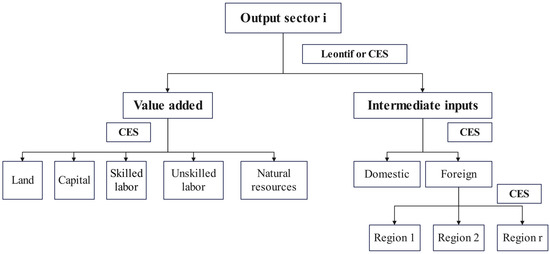 In the model, the production structure is a nested constant elasticity of substitution (CES) function (Figure 2). Each product is a combination of intermediate products and factors of production. There are five types of production factors: land, capital, skilled labor, unskilled labor, and natural resources. Intermediate products comprise domestic and foreign products in the CES function, where different foreign products are aggregated into a single imported product. For the factor market, the model allows flows of capital and labor between production sectors, as well as the partial flow of land between crop production sectors.