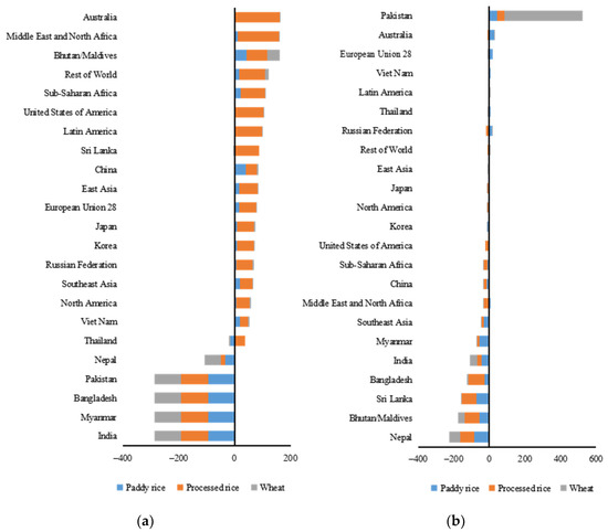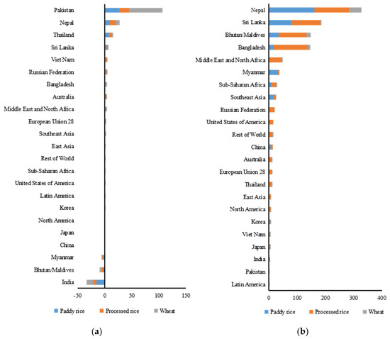 Only India, Myanmar, Bangladesh, Pakistan, and Nepal saw declines in paddy rice, processed rice, and wheat exports, whereas other regions in the world all experienced increases in grain exports. There were regional differences in the intensity of changes (Figure 3a). India, Myanmar, Bangladesh, and Pakistan imposed restrictions on grain exports, which led to a sharp shrinkage in their exports. Nepal was highly dependent on grain imports from India; thus, India’s restrictions on grain exports caused a reduction in Nepal’s grain imports and the decline in the domestic grain supply led to a rise in domestic grain prices [41]. The domestic prices of paddy rice, processed rice, and wheat rose by 9.94%, 10.56%, and 7.48%, respectively (Figure 4). The rise in domestic grain prices further weakened the competitiveness of its grain exports on the international grain market and decreased its paddy rice, processed rice, and wheat exports by 33.00%, 15.39%, and 58.90%, respectively (Table S1). In contrast, Bhutan’s increase in grain yield ensured a sufficient supply of domestic grain, and the drop in its domestic grain prices strengthened its comparative advantages in grain export. Its paddy rice, processed rice, and wheat exports increased by 44.11%, 71.60%, and 47.08%, respectively. In addition, the processed rice exports of the United States, Europe, and China increased by 101%, 62%, and 41%, respectively, while their paddy rice exports increased by 2%, 16%, and 40%, respectively (Table S1).