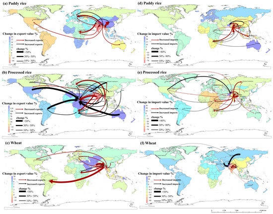 Changes in (a–c) exports and (d–f) imports of major countries and regions after grain export restrictions in South Asian countries. Note: Countries with absolute value changes in exports greater than 10% were selected.