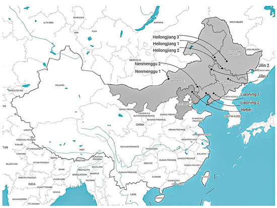 The sheepgrass hay production areas and species in China were investigated before sheep-feeding trials were conducted, and the main production areas of sheepgrass were determined to be in the northern part of China. The samples were collected at the ripening stage. Table 1 shows the chemical composition of the reference grass (miller silage) and the experimental grass (sheepgrass hay). Table 2 lists the provinces from which the 10 most representative sheepgrass hay samples were collected. Figure 1 shows the locations of these regions in China. The 10 samples were selected based on their cultivation area, nutritional composition, and other factors, but it was somewhat difficult to identify the exact varieties used in the present study. To determine the difference in the digestibility of these samples, we selected those that covered a range of nutrient compositions with the goal of building accurate prediction equations through the subsequent sheep-feeding trials.