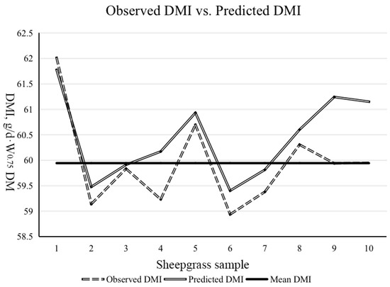 Furthermore, the accuracy of the best-fit prediction equations for DMI (g/d·W0.75), DMD (%), NDFD (%), DE (MJ/kg DM) and ME (MJ/kg DM) in sheepgrass samples is presented in Figure 2, Figure 3 and Figure 4.