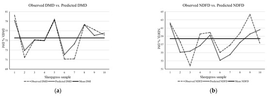 (a) The distribution of observed dry matter digestibility (DMD) and DMD of sheepgrass calculated from best-fit equation; (b) the distribution of observed detergent fiber digestibility (NDFD) and NDFD of sheepgrass calculated from best-fit equation.