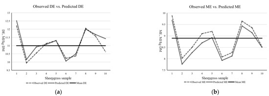 (a) The distribution of observed digestible energy (DE) and DE of sheepgrass calculated from best-fit equation; (b) the distribution of observed metabolizable energy of sheepgrass (ME) and ME of sheepgrass calculated from best-fit equation.