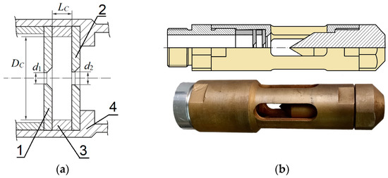 Jet-driven Helmholtz oscillator: (a) design diagram, where 1—front cover with an inlet nozzle, 2—rear cover with an outlet, 3—resonant chamber, and 4—power housing; (b) construction drawing and photography.