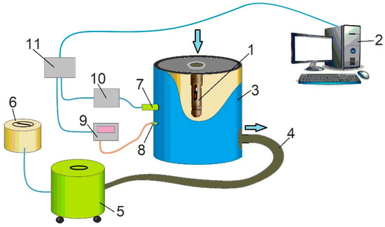The scheme of the experimental setup: 1—emitter, 2—computer, 3—vacuum chamber, 4—pipeline for the removal of the working agent, 5—vacuum pump, 6—linear voltage converter, 7—measuring microphone, 8—fitting for measuring pressure in the vacuum chamber, 9—converter pressure sensor (pressure sensor), 10—microphone amplifier, and 11—ADC module.
