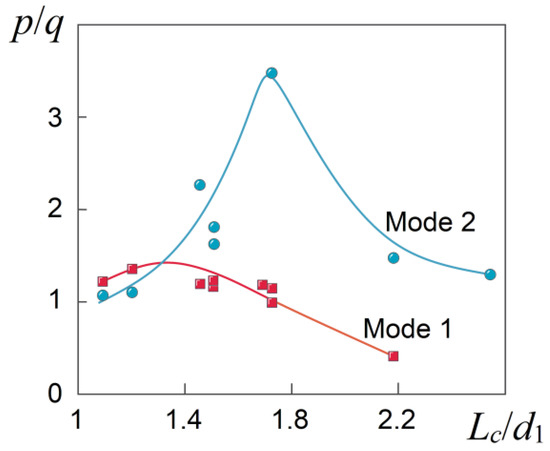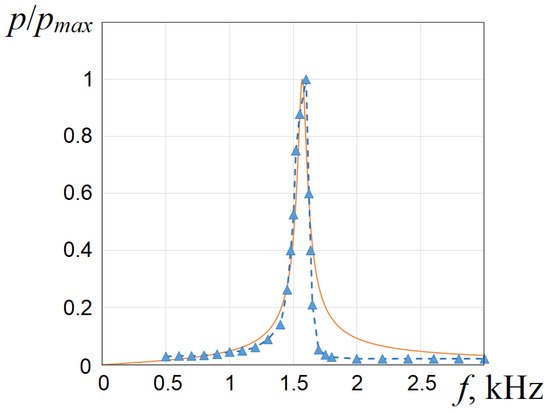 The value was calculated similarly for the first mode and obtained . It should be noted that the values obtained fall within the range of experimental data (Figure 8), for which the values of the amplitude of pressure fluctuations should be maximum.