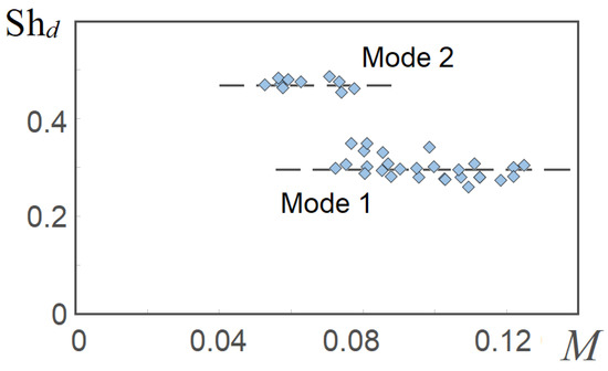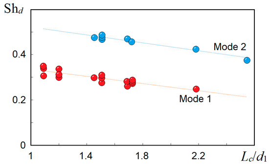 As the jet velocity increases, the amplitude of oscillations increases and, having reached the maximum value (it has its own for each version of the device geometry), begins to decrease. This is accompanied by an increase in the frequency of the generated oscillations. This pattern of changing the parameters of the generated oscillations is known as the mode (Mode). Each mode has its own Strouhal numbers. The first mode (Mode 1) is characterized by high jet velocities, and a further increase in velocity does not lead to the generation of harmonic oscillations at the resonant frequency. Figure 5 shows the dependences of the Strouhal numbers on the dimensionless length of the resonant chamber. The frequency of the generated oscillations and the jet velocity corresponded to the maximum value of the oscillation amplitude within each mode. These dependencies were approximated via the following linear function: