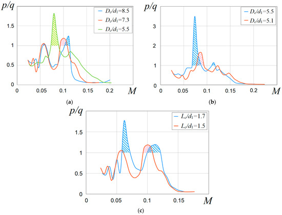 Figure 7 shows the dependences of the relative root-mean-square amplitude of the generated oscillations on the jet velocity (Mach number) for various geometry options. So, for a chamber (DC/d1 = 5.5, LC/d1 = 1.5), the second mode is the strongest, while an increase in the resonant chamber diameter leads to the first mode becoming strong (red and blue lines). Another experiment with LC/d1 = 1.5 showed (Figure 7b) that a decrease in the resonant chamber diameter leads to a decrease in the oscillation generation efficiency—the relative amplitude of the second mode is two times lower. Moreover, the maximum value is shifted towards higher values of speed. There is a completely logical explanation for this, since a resonator with a smaller diameter of the resonant chamber has a higher frequency of natural oscillations and, in order to achieve the required value of the Strouhal number, large jet velocities are required. The hatching on the graphs means that in these ranges of Mach numbers (jet velocity), the emitter operates not only in the hydrodynamic cavitation mode but also in acoustic cavitation due to the generation of intense acoustic waves.