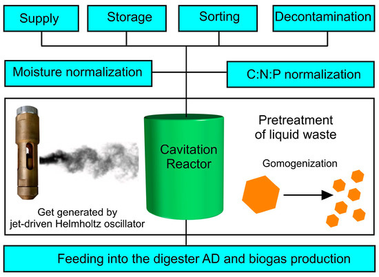 Currently, the design and development of a laboratory–analytical complex for studying the processes of anaerobic digestion on a semi-industrial scale with a hydraulic mixing system [64], as well as subsequent thermochemical conversion of the digestate [65], is underway. It is planned to use a cavitation reactor for the pre-treatment of agricultural waste.