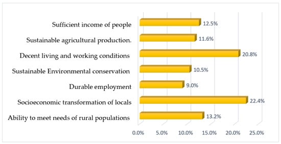 The results in Figure 2 show that the socioeconomic advancement of locals (22.4%) is a major aspect of sustainable rural economic development, which is followed by decent living and working conditions (especially for those involved in farming) (20.8%), followed by the ability to meet the needs of rural populations (13.2%), the offering of a sufficient income (12.5%), and sustainable environmental conservation (10.5%). It is important to note that sustainable environmental conditions greatly contribute to supporting both regional economies as well as urban–rural connections.