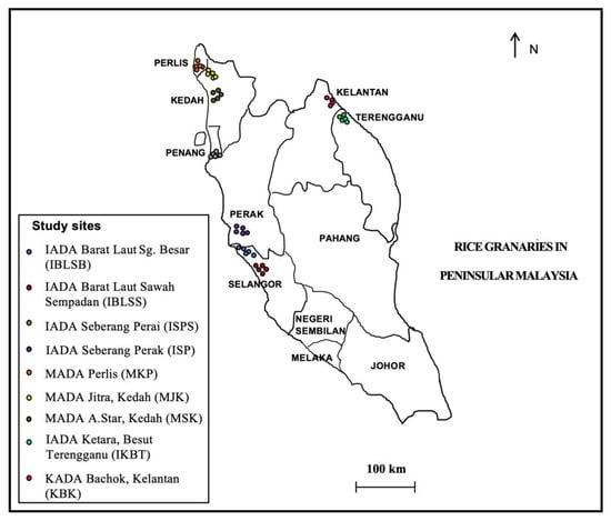- Baki, B.B.; Shakirin, M.M. Spatio-temporal distribution pattern of new biotypes of weedy rice (Oryza sativa L.) in Selangor north-west project, Malaysia. Korean J. Weed Sci. 2010, 30, 68–83. [Google Scholar] [CrossRef]