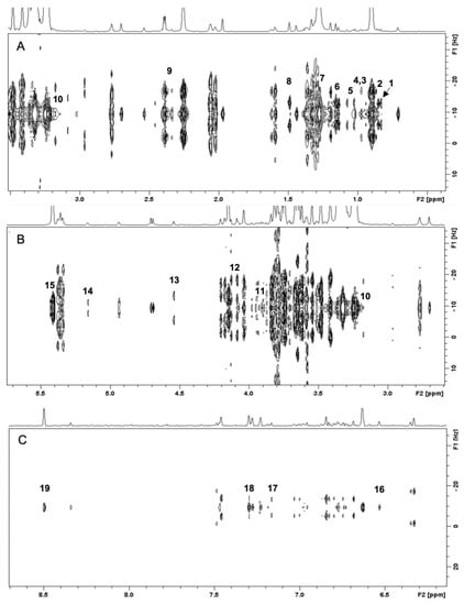 | Isoleucine | δ 0.95 (t, J = 7.5), δ 1.03 (d, J = 7.0), | 🗸 | 🗸 |