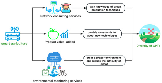 We attempt to verify the pathway of smart agriculture’s impact on the diversity of green production. Based on the research base of scholars, we believe there are three possible paths: First, smart agriculture relies on the development of the Internet of Things to provide farmers with a range of web-based advisory services [19]. This makes it easier for farmers to access professional farming technology via the internet, thus enhancing their knowledge of green technology [20,21]. Second, based on internet food safety traceability, smart agriculture increases the added value of agricultural products, which in turn influences farmers’ decisions on technological improvements [22]. Third, smart agriculture enables accurate monitoring and assessment of the soil and growing environment. Smart fertilizer management techniques leverage data, sensors, and advanced tools to ensure accurate fertilization levels in agricultural production [23], which builds a proper environment and reduces the difficulty of GPT adoption. It can also ensure the quality of agricultural products [24], which could bring more profits. The expansion of information sources has also influenced farmers’ awareness of green production. The dual influence of awareness and technical knowledge promotes greater adoption of green production techniques among farmers. The mechanisms of influence are shown in Figure 1.