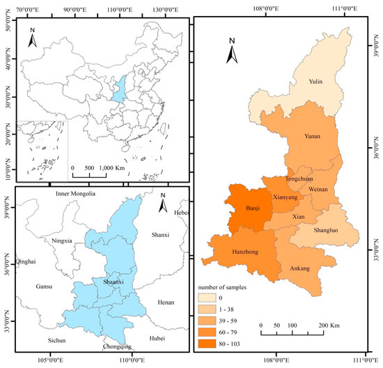 This paper’s research samples were family farms registered by the Ministry of Agriculture and Rural Development. In May 2022, a project team collected data from Shaanxi Province, a primarily agricultural province in Northwest China. The team randomly selected family farms from nine municipalities, covering the topography of Shaanxi Province from north to south. Shaanxi Province, as a largely agricultural province in western China, has significantly different natural conditions for agricultural production, rich policies for cultivating family farms, and many agriculture-related universities and agricultural enterprises, which can better reflect the impact of smart agriculture on farmers’ green production behavior under differentiated farm characteristics. The sample research sites are divided into family farm demonstration counties and general counties and districts. Figure 2 shows the specific sample distribution. The project team distributed questionnaires to 650 family farms, of which 624 were recovered as valid. This indicates an effective recovery rate of 96%. The questionnaire was a comprehensive and systematic interview survey that covered individual farmer characteristics, farm production and operation, financial lending, risk management, and green agriculture. To focus on the adoption of diversity in green production technology, we excluded purely breeding family farms from the sample. As a result, our sample contained 563 family farms.