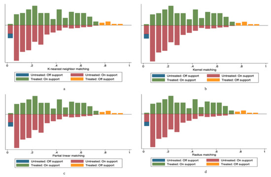 Prior to presenting the treatment estimation results, we assessed the matching quality of both methods by evaluating the overall bias and the common support of the propensity scores. From the results of the balance test (see Table A1 and Table A2), it can be seen that, after matching the samples, the standardized bias of the explanatory variables decreased from 38.9% to 2.3–8.5%, and the total bias was significantly lower and less than the 20% level specified by the equilibrium test; the pseudo R2 decreased from 0.157 before settling at 0.002–0.024 after matching; and the LR statistic decreased from 99.61 before matching to 0.87–8.78 after it. Based on the test methods of [21], the results show that the PSM method can effectively reduce the differences in the distribution of explanatory variables between the control and treatment groups and eliminate the estimation bias caused by sample self-selection in our study. Additionally, Figure 3 demonstrates common support in the distribution of the predicted propensity scores between the adoption and non-adoption of smart agriculture. Most observations are within the common range of values (on support in green and red).